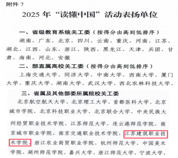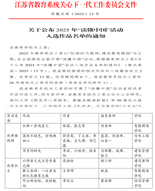 近日,教育部关工委发布《关于公布2025年“读懂中国”活动入选作品名单的通知》,我校在教育部关工委2025年“读懂中国”活动中被表扬,这也是我校连续五年荣获该活动表扬单位。