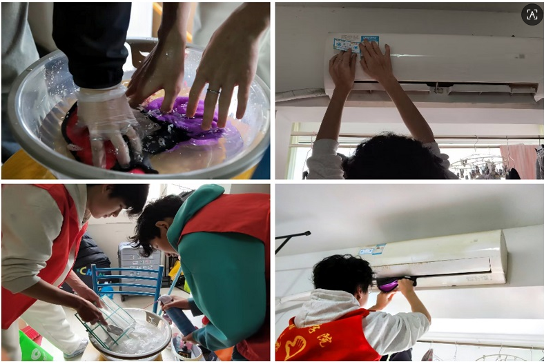 活动中,空调专业志愿者聚焦“净风护健康”,开展空调清洁与节能服务。大家携带专业工具,为宿舍、办公楼免费进行空调滤网清洗、出风口除尘保养,并对空调运行状态进行简易检查。同时,志愿者向同学们普及空调合理温度设置、定期清洁维护、科学通风及节能使用知识,引导大家养成健康、绿色、安全的用风习惯。